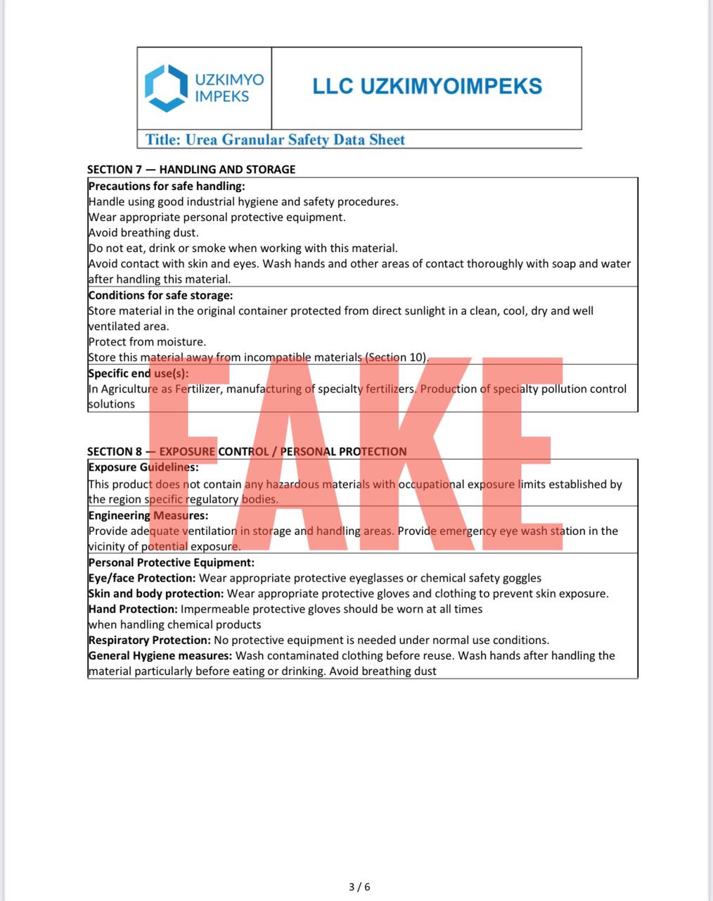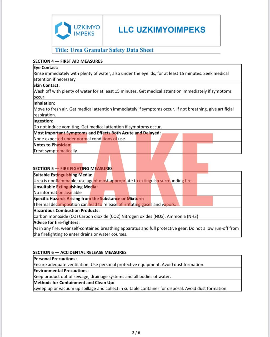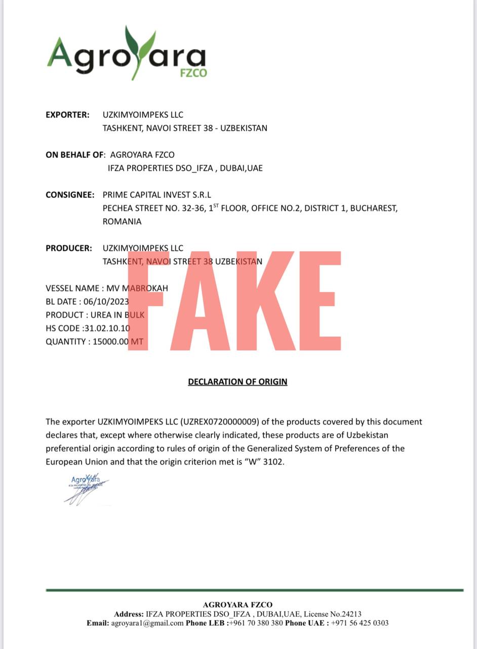 We inform you that this agreement and the accompanying documents specified in it are fake. There are no contractual relations between Uzkimyoimpeks LLC and the Dubai company Agroyara FZCO, and the above-mentioned 40 thousand tons of urea were not produced in the Republic of Uzbekistan.