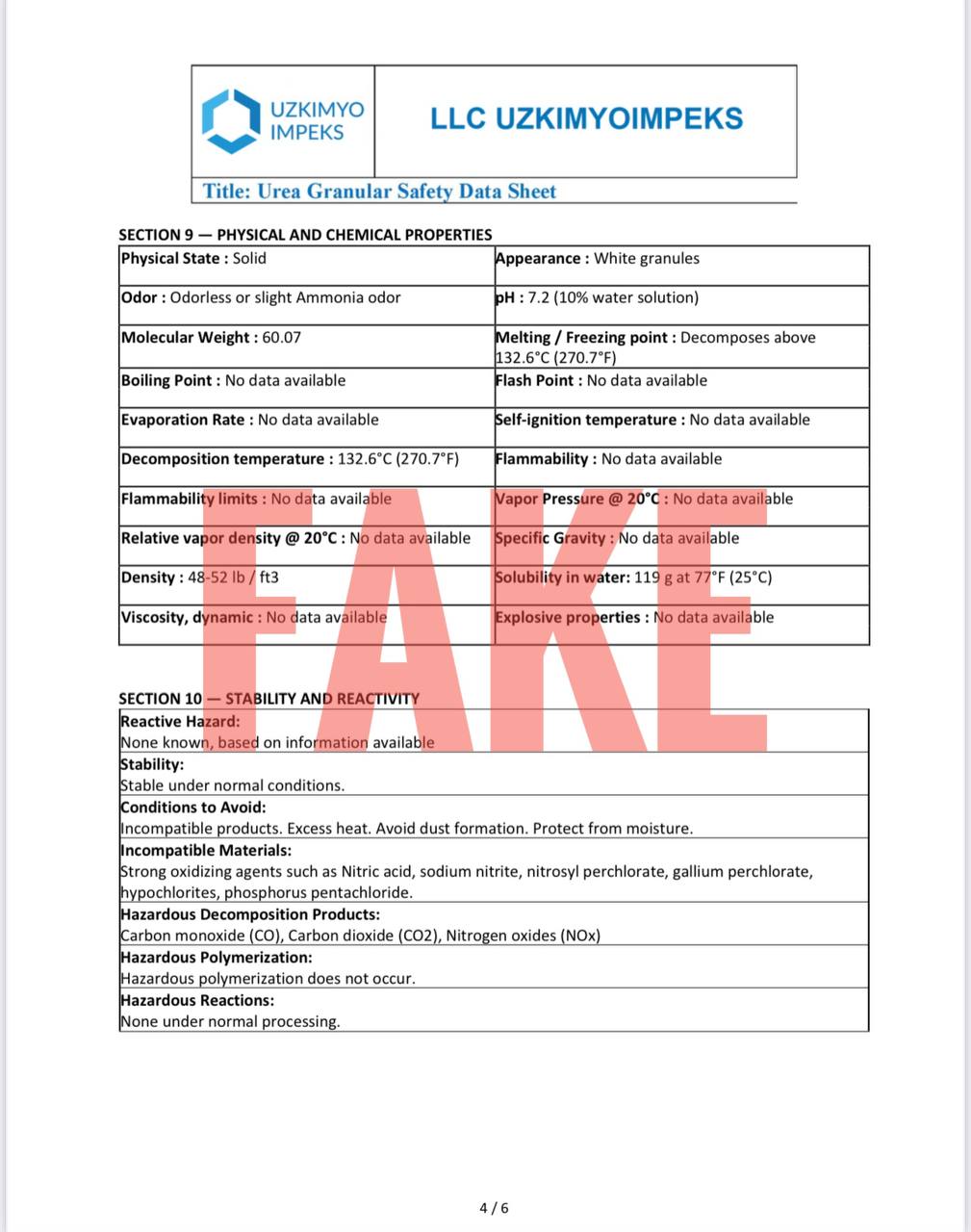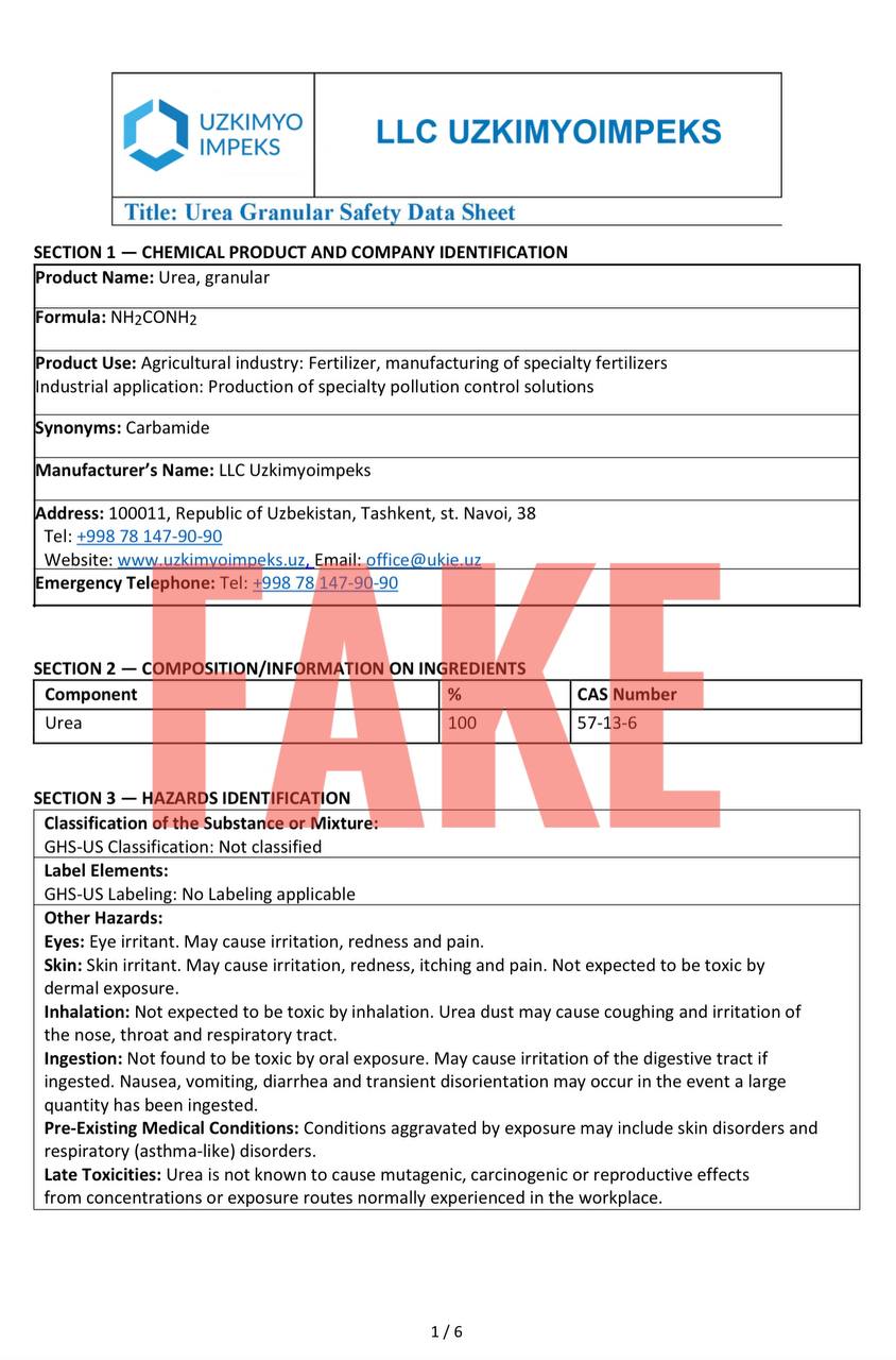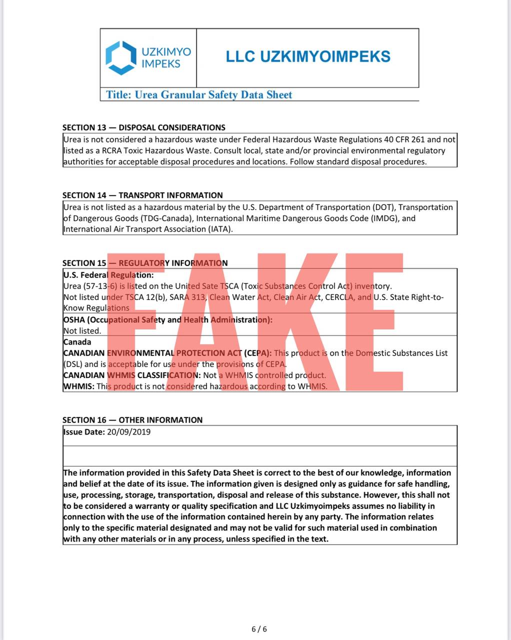 We inform you that this agreement and the accompanying documents specified in it are fake. There are no contractual relations between Uzkimyoimpeks LLC and the Dubai company Agroyara FZCO, and the above-mentioned 40 thousand tons of urea were not produced in the Republic of Uzbekistan.