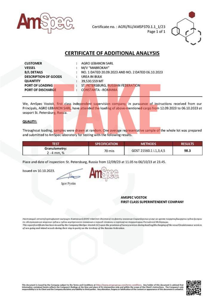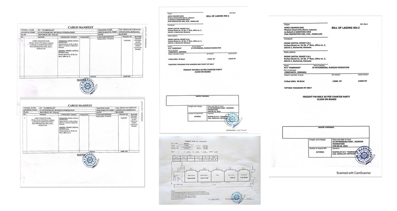 The Dubai company Agroyara FZCO, on behalf of the Lebanese company Agro Lebanon Sarl, on the basis of forged documents, sent 40,000 tons of urea, allegedly purchased from Uzkimyoimpeks LLC, to the Romanian company Prime Capital Invest S.R.L. to the port of Constanta (Romania).