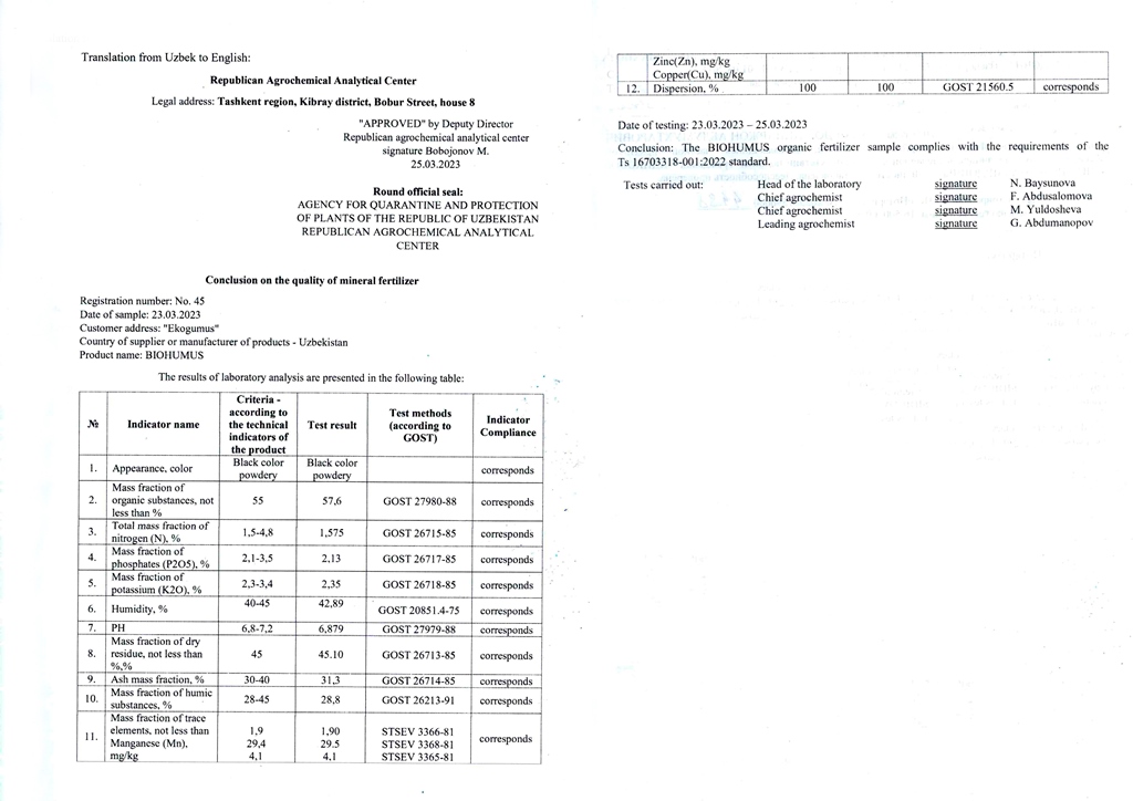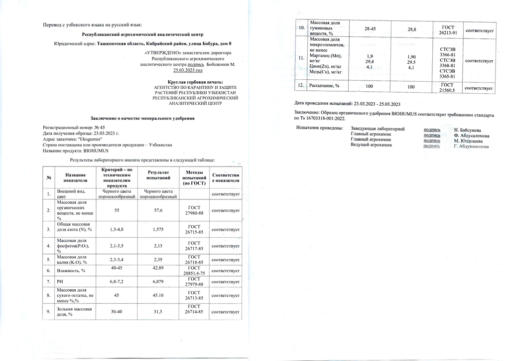 Uzkimyoimpeks" company offers "BIOHUMUS" product for export